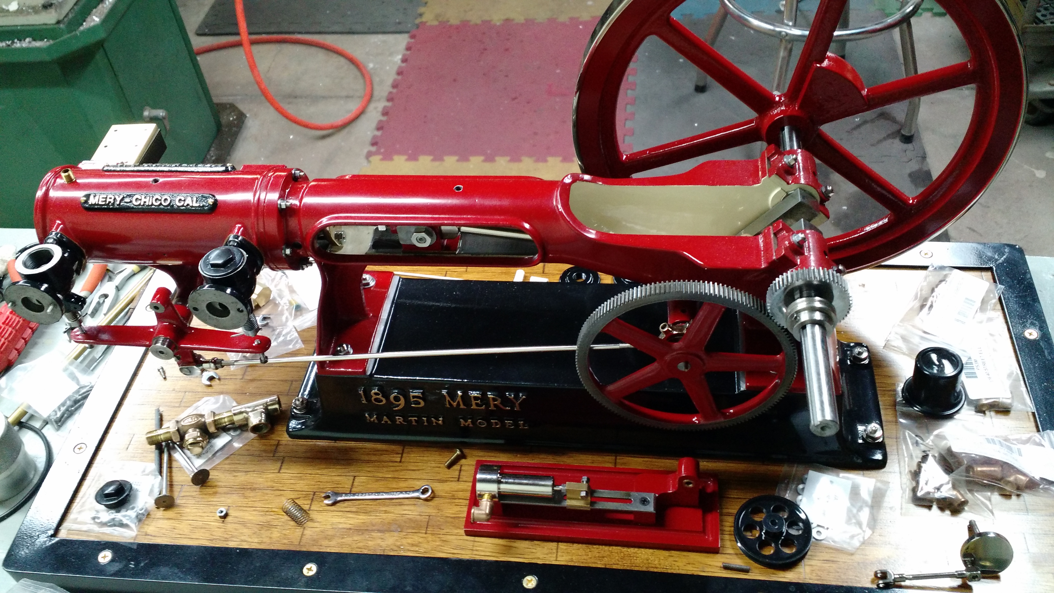 It's been a while since I posted any updates. I spent the past winter doing the finish polishing, plating and painting. I actually ended up painting several parts a few times. I painted the main body and a few other parts with color then clear using Krylon. The clear was so brittle that as soon as I tightened a nut against it, the clear shattered like glass. So I striped and repainted with Rustoleum. That paint is much less brittle. I also plated most of the hardware with nickel plate. I didn't get all of the parts done so I'll have to setup the plating tanks again. The photos here are with a lot of the parts assembled. The picture on the rigth end has the cooling pump. I tried to build a centrifugal pump but to build one to a reasonable scale just didn't work to move water. I resorted to a positive displacement pump instead. It's my own design and hopefully works. It's belt driven by a large O-ring from the main shaft.