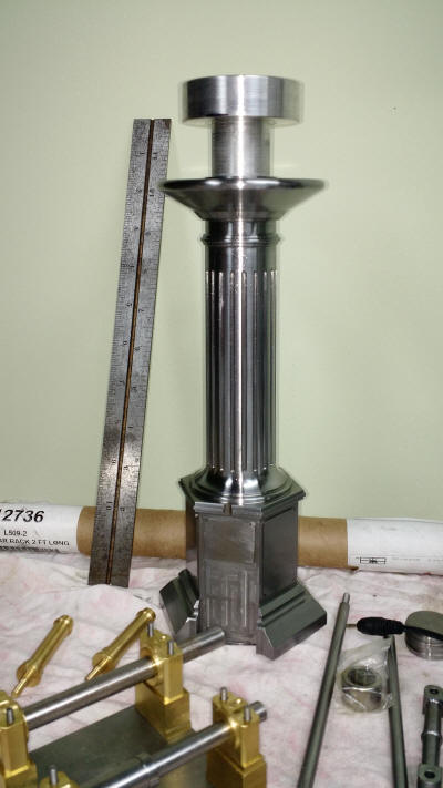 I mounted the column into the index head for the milling part. Notice the aluminum plug in the center end of the column in the top. That has a tapped hole in the bottom and I have a piece of all thread running down through the chuck and out the back. This is helping to keep the whole package together since the chuck jaws are only about a 1/2" deep. It worked out great. The panels on the bottom were pretty straight forward. The flutes on the column however, were tedious. The column is tapered so I had to kick the tailstock up a bit then cut those flutes. A couple passes with a 1/16" carbide ball mill then switch to the 3/32" carbide ball mill. The bottom shot is the column almost done. While I think of it, leadloy rusts very easily. I've been wiping those parts down with "Breakfree CLP". It really seems to help keep the rust down.